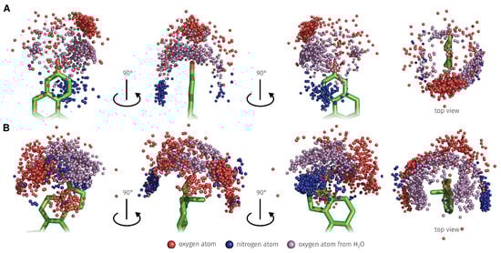 Distribution and different perspectives of the detected base interaction atoms during the 25 ns MD simulation that formed O–H⋯O–H⋯O (red, purple, and red atoms) and N–H⋯O–H⋯O (blue, purple and red atoms) water-mediated H-bonds. (A) The focus is on the 3-position of E2. (B) The focus is on the 17--position of E2. E2, 17-estradiol.