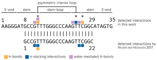 Hilder and Hodgkiss [35] identified the four bases G4, T5, T18, and C19 as the predominant binding partners of E2 in their study (Figure 10). The aptamer of Hilder and Hodgkiss [35] is a subsequent of the aptamer presented here, but originates from the same underlying study [16]. The sequence core area that can bind E2 is the same, only the 5-end and 3-end are different. Therefore, the base G1 of the short 22-base aptamer sequence [16,35] is the base G8 of the longer 35-base aptamer sequence and so on. In our study, we have chosen the 35-base aptamer sequence, because the 5- and 3-end can potentially be used for immobilization on different substrates [16]. It is advantageous to examine the dynamics of the 5-end and 3-end to ensure that it will not interact with E2 or otherwise be integrated into the bond and will not cause any changes in the conformation of the asymmetric interior loop.