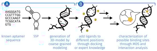Schematic overview of the developed workflow for detailed analysis of ligand-aptamer interactions. (A) Starting from a known ligand-specific aptamer sequence and the prediction of the secondary structure, the 3D structure is modeled. (B) The modeled 3D structure is the basis for the MD simulation. First, the ligand is integrated within the structure through docking or expert knowledge. After the MD simulation, the resulting structures of the individual time steps are examined for possible binding sites and the interactions formed are detected. MDS, molecular dynamics simulation; SSP, secondary structure prediction.