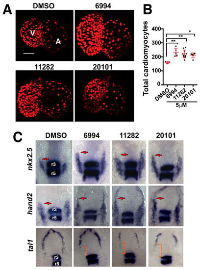 During cardiac development, Fgfs play important roles in heart formation, particularly in defining organ size [14,16]. Consistent with these results, we had previously observed that BCI increased zebrafish cardiac progenitor cell pools and enlarged heart organ size upon treatment limited to somitogenesis stages [19]. We tested whether agents from this screen could also increase heart organ size by treating Tg(5.7myl7:nDsRed2)f2 embryos. This transgenic line expresses nuclear DsRed2 fluorescent protein under the control of a cardiac myosin light chain 7 promoter, thus enabling the enumeration of differentiated cardiomyocytes [37]. We treated Tg(5.7myl7:nDsRed2)f2 embryos at the one-somite stage (10.3 hpf) with ST006994, ST011282, and ST020101, and at the eight-somite stage (11.3 hpf), compounds were washed out. At 72 hpf, treated transgenic embryos were scored for cardiomyocytes in the beating heart (Figure 4A). The enumeration of both ventricular and atrial cardiomyocytes revealed a statistically significant increase in nuclear DsRed2 expressing cells with all three compounds tested (Figure 4B). The observed increase in cardiomyocytes is consistent with an expansion of cardiac progenitor pools through Fgf hyperactivation at early somitogenesis stages, as the domains of expression of nkx2.5 and hand2, two cardiac transcription factors, were expanded towards the rostral domain (Figure 4C), and a concomitant decrease was seen in the endothelial population. This indicates that the endothelial progenitor population undergoes a fate change to increase the cardiac population, as previously reported [38]. The data indicate that ST006994, ST011282, and ST020101 hyperactivated Fgf signaling, resulting in increased cardiac progenitor pools, which translated into increased numbers of ventricular cardiomyocytes and overall cardiac size.