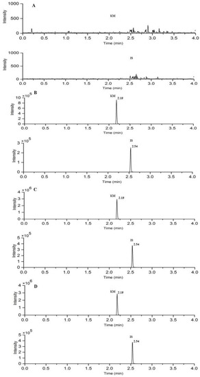 Typical chromatograms of (A) blank rat plasma; (B) blank rat plasma spiked with KM and IS; (C) rat plasma sample at 20 min; and, (D) liver sample at 30 min after a single intravenous dose of 10 mg/kg KM. Representative MRM chromatograms of KM and IS.