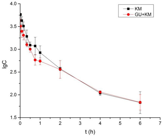 The pharmacokinetics parameters, including the areas under concentration-time curve (AUC0–6 and AUC0–∞), mean retention time (MRT0–t and MRT0–∞), the half-time (t1/2z), clearance (CLZ), apparent volume of distribution (Vz), and maximum plasma concentration (Cmax) were presented in Table 5. The parameters of KM in the GU + KM group, such as Cmax, t1/2z, AUC0–6, AUC0–∞, and CLZ statistically differed from those in control group (The p-values for Cmax, t1/2z, AUC0–6, AUC0–∞, CLZ, and VZ were 0.015, 0.035, 0.019, 0.039, and 0.029, p < 0.05.). Moreover, notably, the VZ showed significant differences between the two groups (The p-values for VZ was 0.002, p < 0.01). The results implied that GU may have effects on reducing the exposure of KM. The mean plasma concentration-time profiles were shown in Figure 3.