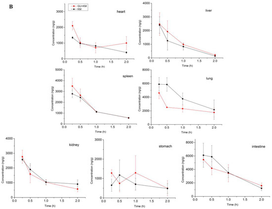 The concentrations of KM in various tissues for both groups are shown in Figure 4A. At 15 min after intravenous injection, different concentrations of KM were detected in all of the rat tissues. It showed that KM could be distributed widely and rapidly in various tissues. With the extent of time, the concentrations of KM in most of the tissues decreased obviously in 2 h. This indicated that there was no long-term accumulation of KM, which was in accordance with the change of plasma concentration. For the control group, the highest concentration level was observed in intestine (6109.35 ± 1795.14 ng/g), followed by lung (5893.27 ± 1383.72 ng/g), spleen (2781.9 ± 348.6 ng/g), kidney (2571.9 ± 82.2 ng/g), liver (2402.2 ± 1406.0 ng/g) heart (1623.2 ± 477.8 ng/g), and stomach (655.6 ± 315.6 ng/g), which implied that intestine and lung might be the target organs of KM. That is probably the pharmacokinetics basis of KM for good therapeutic effect on digestive system tumors [11]. The higher concentration of kidney and liver demonstrated that KM was mainly accumulated in liver and renal excretion might be a main elimination route for KM. In addition, there was a statistic difference for the tissue concentration for lung and stomach between the two groups (p < 0.05. The p values were 0.041, 0.037, and 0.014 for stomach at 0.25 h, and lung at 0.5 h and 1 h, respectively). Moreover, it is showed in Figure 4B that concentration of KM declined more sharply for the GU + KM group than the control group. These results give a hint that GU may affect the pharmacokinetics and tissue distribution characteristics of KM.