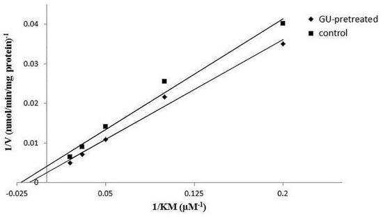 Lineweaver-Burk plot of 5, 10, 20, 30, and 50 μm KM that received or did not receive GU following 30 min of incubation.