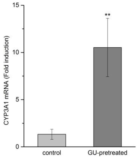 Effect of GU on the induction of CYP3A1 mRNA expression (n = 5). Data are expressed as mean ± SD. ** p < 0.05 compared with the control group.