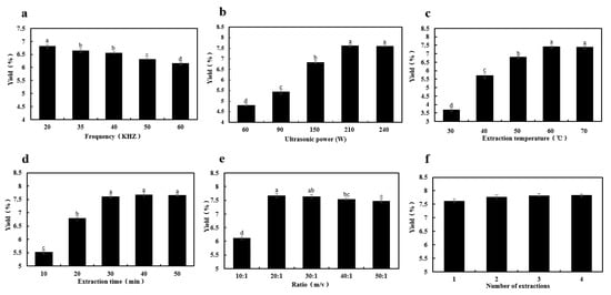 Effect of ultrasound frequency (a), ultrasound power (b), extraction temperature (c), extraction time (d), ratio of liquid to raw material (e) and number of extractions (f) on the yield of UAP-VVP (a–d represent the significant differences between various experiments for p < 0.05).