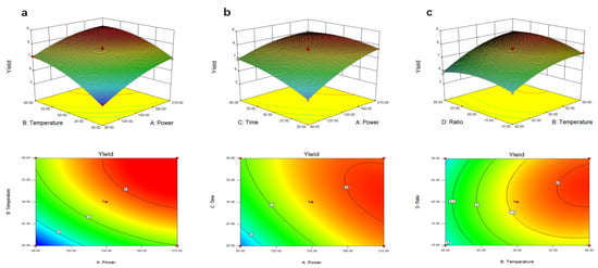 Figure 2a presents the interaction relationship between the two independent variables (ultrasound power and extraction temperature) and the response variable (UAE-VVP yield) by keeping the other independent variables (extraction time and ratio) as constants (30 min and 20:1, respectively). It was obvious that the UAE-VVP yield showed the corresponding significant changes when ultrasound power and extraction temperature were subjected to small alterations. An increase in the UAE-VVP yield could be significantly achieved with the increases of ultrasound power and extraction temperature. Under certain condition (ultrasound power over 135 W, coded as −0.25~1; extraction temperature over 48 °C, coded as −0.20~1), a maximal contour (YUAE-VVP yield = 8.21%) could be determined (Figure 2a), meaning that further increases of ultrasound power and extraction temperature would not increase the polysaccharide yield levels significantly, which were in accordance with the results obtained in one-factor-at-a-time experiments.