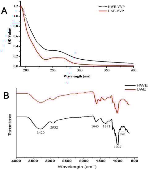 UV spectrograms (A) and Fourier transform infrared spectra (B) of HWE-VVP and UAE-VVP.