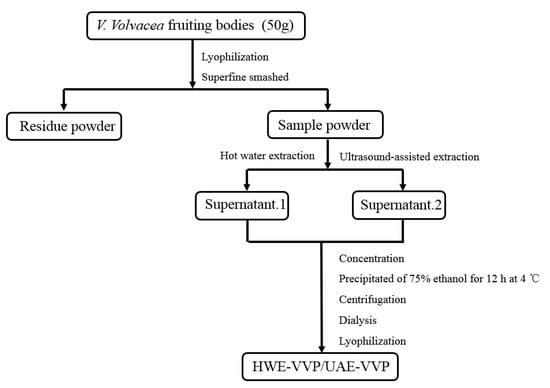 As shown in Figure 4, hot water extraction (HWE) were carried out twice by mixing 50 g of ground V. volvacea fruiting bodies with 1000 mL of distilled water, heating for 100 °C for 2 h using a water bath, and centrifuging at 10,000× g for 20 min. The combined supernatants were concentrated under reduced pressure and precipitated with a final concentration of 75% ethanol for 12 h at 4 °C. The precipitation was collected by centrifugation (10,000× g, 15 min), followed by dialyzing against distilled water, and lyophilized to yield crude polysaccharides (HWE-VVP).