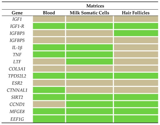 The expressions of three genes, namely insulin-like growth factor binding protein 5 (IGFBP5), collagen type III alpha 1 chain (COL3A1), and estrogen receptor 2 (ESR2), were not detected in the matrices tested (Figure 1). In addition, the expression of IGF-1 was only detected in one cow in the milk somatic cells. The number of target genes in which expression was detected in this study varied in each matrix. In milk somatic-cell samples, the expressions of nine genes were detected, and the transcription of lactotransferrin (LTF) was only detected in this matrix. In blood samples, the expressions of eight genes were observed, and the transcription of catenin alpha-like 1 (CTNNAL1) was only detected in this matrix. Finally, in hair-follicle samples, the transcriptions of seven genes were observed, and the expression of insulin-like growth factor binding protein 3 (IGFBP3) was detected in this matrix.
