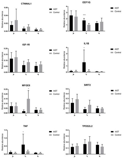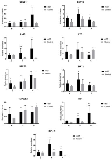 Relative abundance of target genes expressed in milk somatic-cell samples before rbST administration, and on the third and ninth days after rbST administration. The bars represent the mean value of each group (rbST and control). The value used for each animal is the mean of three replicates. * p < 0.05, ** p < 0.01, *** p < 0.001.