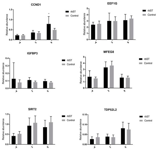 The IL-1β, insulin-like growth factor 1 receptor (IGF-1R), and TNF genes were significantly upregulated (Figure 3) in the rbST group on the third and ninth days after recombinant-hormone administration. The cyclin D1 (CCND1) gene was significantly upregulated in the rbST group on the ninth day. On the other hand, LTF and tumor protein D52-like 2 (TDP52L2) were significantly upregulated on the ninth day in the control group. The transcription of EEF1G was significantly different between both groups for all sample points, including those before rbST administration, and MFEG8 expression was higher in the rbST group on the sixth day prior to administration, but not after rbST administration.