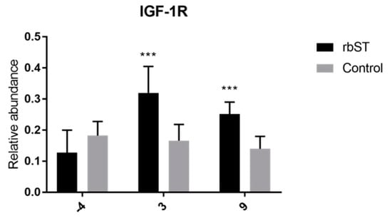 Relative abundance of target genes expressed in blood samples before the administration of recombinant bovine somatotropin (rbST), and on the third and ninth days after rbST administration. The bars represent the mean value of each group (rbST and control). The value used for each animal is the mean of three replicates; * p < 0.05, *** p < 0.001.