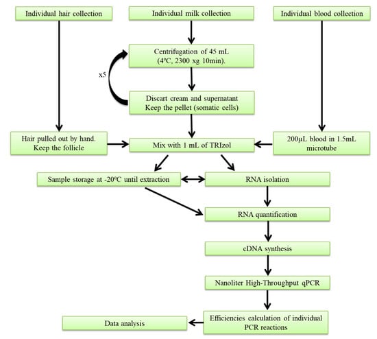 Milk somatic-cell collection was carried out before rbST treatment, and on the third and ninth days after rbST administration. Briefly, two liters of homogenized milk from the morning milking of each cow was collected at the milking parlor in sterile bottles (Deltalab, Barcelona, Spain), and was immediately transported in refrigerated conditions to the laboratory. Before milking, the udder was cleaned, and the initial contaminated milk streams were dismissed. The remaining milk that was not collected for experimental assays was discarded. A total volume of 225 mL of fresh milk was used to collect the milk somatic cells (MSCs) for analysis. The protocol followed for isolating MSCs is shown in Figure 5. Briefly, 50-mL conical centrifuge polypropylene tubes were filled with 45 mL of milk, and were centrifuged at 4500 rpm for 10 min at 4 °C. The supernatant (fat and whey) was discarded, keeping the pellet, and then, the tubes were again filled with 45 mL of milk, and centrifuged once more. This step was repeated five times for each sample in the same conical plastic tube in an effort to concentrate the pellet. Then, the milk pellet containing the MSCs was mixed with 1 mL of TRIzol (AmbionTM, Thermo Fisher Scientific, Waltham, MA, USA), before being transferred to a 1.5-mL microtube and stored at −20 °C until further use. Additionally, a total of three MSCs samples from other dairy farms were collected following the same procedure.