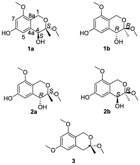 Compound 1 (Figure 1) was obtained as a yellow gum. The molecular formula of 1 was established using HRESIMS as C12H16O5 (found 263.0897, calculated for [M + Na]+ 263.0890). The infrared (IR) spectrum showed intense absorption bands of hydroxy at νmax 3397.5 cm−1 (OH), and 1613.2 cm−1 and 1371.6 cm−1 (phenyl), as well as a methylene band at 2932.1 cm−1. The 1H NMR spectrum displayed two aromatic proton signals at δ 6.38 (1H, d, J = 2.2 Hz, H-5) and 6.33 (1H, d, J = 2.2 Hz, H-7), two methoxyl signals at δ 3.76 (3H, s, 8-OMe) and 3.30 (3H, s, 3-OMe), one oxymethylene signal at δ 4.46 (1H, d, J = 15.3 Hz, H-1) and 4.41 (1H, d, J = 15.3 Hz, H-1), and one methine signal at δ 4.00 (1H, s, H-4) and 1.46 (3H, s, 3-Me). The 13C NMR and DEPT spectra of Compound 1 exhibited 12 carbon signals, including six aromatic carbons at δ 158.4 (C-8), 157.2 (C-6), 137.3 (C-4a), 114.2 (C-8a), 109.0 (C-5), and 99.0 (C-7), a quaternary carbon at δ 101.5 (C-3), one methine carbon at δ 70.4 (C-4), one methylene carbon at δ 60.7 (C-1), two methoxyl carbons at δ 55.8 (8-OMe) and 49.8 (3-OMe), and a methyl signal at δ 19.1 (C-3). The HMBC correlations of H-1/C-8 and C-3, H-5/C-4, 3-Me/C-3 and C-4, 3-OMe/C-3, and 8-OMe/C-8, as well as the NOESY correlations of H-7/8-OMe confirmed the presence of an isochromane scaffold, and the primary structure of 1 was established as 3,8-dimethoxy-3-methylisochromane-4,6-diol (Figure 2). The NOESY correlations of H-4/3-OMe indicated that the relative configuration of 1 should be 3R*,4R* (Figure 3). Compound 1 was presumed to be a mixture of enantiomers, as its optical rotation was approximate to zero. Further chiral HPLC analysis confirmed the presence of a pair of anticipated enantiomers. Subsequent chiral resolution was applied, and two enantiomers, 1a and 1b, were obtained successfully. The ECD experiment and ECD calculation of 1 were conducted to determine its absolute configuration. The calculated ECD spectra of 3S, 4S-1 fitted the experimental spectrum of 1a nicely, while the calculated ECD spectra of 3R, 4R-1 matched the experimental spectra of 1b quite well, allowing the absolute configurations of 1a and 1b to be determined as 3S, 4S and 3R, 4R, respectively.