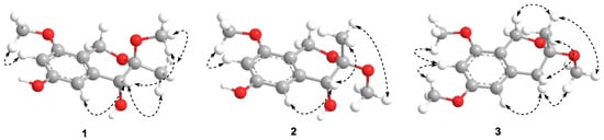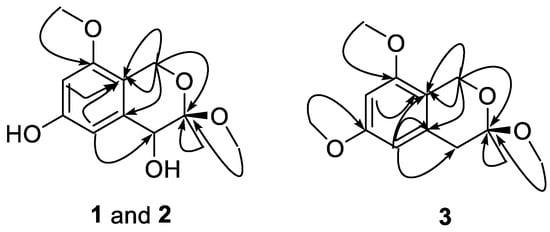 Compound 3 (Figure 1) was isolated as a yellow gum. Its molecular formula was established as C13H18O4 on the basis of the HRESIMS through the pseudo-molecular ion peak at m/z 261.1107 [M + Na]+ (calculated for 261.1097). The 1H and 13C NMR spectra indicated that 3 possessed a similar structure to 1 and 2 except for a methylene (δH: 2.85, d, J = 16.4 Hz, 2.73, d, J = 16.4 Hz; δC: 39.8) instead of a methine group at C-4, and the presence of another methoxyl (δH: 3.78; δC: 55.7). The HMBC correlation of 6-Me/C-6 readily located this methoxyl at C-6. Thus, 3 was elucidated to be 3,6,8-trimethoxy-3-methylisochromane.