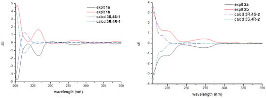 Experimental electronic circular dichroism (ECD) spectra of Compounds 1 and 2 and their calculated curves.