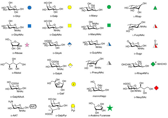 Representation of the monosaccharide building blocks contained in the glycans of pathogen cell wall PS accounted in this manuscript.
