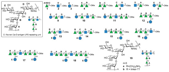 The Shigella family includes four different groups of Gram-negative bacteria—S. dysenteriae, S. sonnei, S. flexneri and S. boydii—each of them comprising different serotypes. Shigella is the causative agent of endemic and epidemic shigellosis or bacillary dysentery, an invasive disease of the lower intestine, highly diffused in developing countries and particularly in pediatric population. The development of a fully synthetic glycoconjugate vaccine against S. dysenteriae type 1 is currently under investigation, using fragments of the O-antigen of the Shigella LPS. Oligomers up to four repeating units of the tetrasaccharide [α-l-Rha-(1→2)-α-d-Gal-(1→3)-α-d-GlcNAc-(1→3)-α-l-Rha] were first synthesized by Pozsgay and covalently linked to human serum albumin (HSA) [13,14]. Preliminary studies showed that the hexadecasaccharide (n = 4) is the most immunogenic fragment able to elicit anti O-SP-specific IgG in mice [14] and that the upstream residue (non-reducing end) of the synthetic fragments is crucial for the immunogenicity of these conjugates [15].
