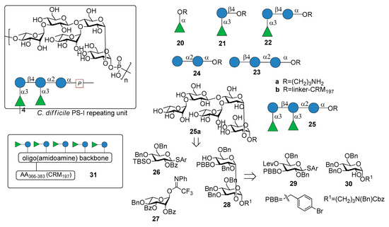 Recently, Martin et al. reported the synthesis of the pentasaccharide repeating unit of PS-I cell wall polysaccharide of C. difficile ribotype 027 (Figure 3), of its related substructures (compounds 20a–25a, Figure 3) and their immunological evaluation for the identification of the minimal epitope [29].