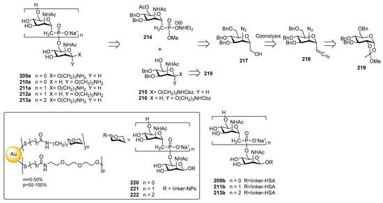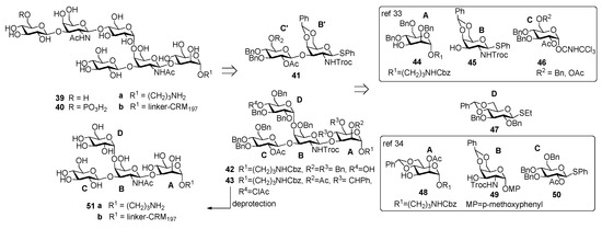 Danieli et al. [33] reported the synthesis of hexasaccharide 39a and its phosphorylated analogue 40a, starting from disaccharide 41 and tetrasaccharide 42 (or its analogue 43) via a [4+2] convergent approach (Figure 5).
