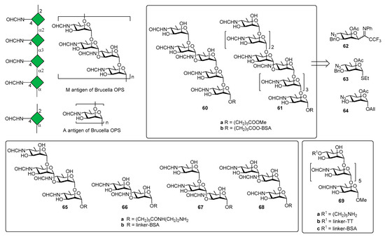 In 2013, the Bundle group [54] reported the synthesis of pentasaccharide 60a (Figure 7) and nonasaccharide 61a, starting from monosaccharides 62, 63 and 64. The synthetic compounds were tested for antigenicity, after conjugation with bovine serum albumin (BSA) [54]. Glycoconjugate 60b was designed to selectively exhibit the M epitope with limited cross reactivity with A-specific antibodies. The nonasaccharide conjugate (compound 61b), containing A and M epitopes, was designed as a possible universal antigen to detect antibodies in animals or humans infected by B. abortus, B. melitensis, and B. suis. An ELISA test was performed with two monoclonal antibodies (YsT9-1 and Bm10) specific for the Brucella A and M antigens, respectively. Interestingly, nonasaccharide antigen 61a bound A- and M-specific antibodies with equivalent avidity, whereas pentasaccharide 60a displays a preference for the M-specific antibody, as expected. However, pentasaccharide 60a, still displaying α(1,2)-linked residues, retained modest to good binding to A-specific mAbs. This initial result paved the way to produce a glycoconjugate vaccine that would not raise antibodies giving false positive results in diagnostic tests for infection. Indeed, the detection of specific anti-M antibodies would indicate infection by Brucella and not by one of the other closely related bacteria that have PS containing 1,2-linked Rha4NFo or Rha4NAc and are known to induce antibodies reactive in the serological test for brucellosis [55]. In a following work, tetrasaccharide 65a, disaccharide 66a and trisaccharides 67a and 68a (Figure 7) were synthesized to assess the largest and smallest M epitopes [56]. International standard B. abortus serum prepared from cattle experimentally infected with an A-dominant strain bound strongly to disaccharide-BSA conjugate 66b and M tetrasaccharide-BSA conjugate 65b [56]. In addition, 65b and 66b also showed strong binding to M-specific mAbs and weak binding with A-specific mAbs. It was also observed that antibodies raised against exclusively α(1,2)-linked Rhap4NFo did not bind well to the 1,3-linked disaccharide [57]. Further improvement of serodiagnosis of brucellosis came when a tether was introduced at the O-4 of the upstream residue (heptasaccharide 69a, Figure 7) [58]. In particular, conjugate 69b (TT) was used for mice immunization and conjugate 68c (with bovine serum albumin, BSA) to monitor antibody responses by ELISA. Mice immunization with glycoconjugate 69b showed that antibodies to the Brucella A antigen could be produced and that these antibodies didn’t react in diagnostic tests based on the M antigen. These findings were confirmed by the results of immunization studies with the OPS of B. abortus strain S99, which contains 98% α-(1,2) and only 2% α(1,3) linkages conjugated to tetanus toxoid. The OPS was subjected to an oxidation reaction using a procedure that concomitantly oxidized all terminal d-Rhap4NFo residue, essentially destroying the M epitope [58]. Immunization studies in mice showed that antibodies against the A epitope dominated. Taken together, all these studies contributed to identify the main elements for a glycoconjugate vaccine candidate for brucellosis and demonstrated that diagnostics based upon the M or A (terminal) epitopes can discriminate infected from vaccinated animals.