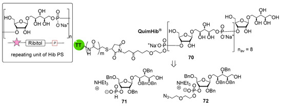 The first generation of Hib vaccines, made with purified polyribosyl-ribitol phosphate, induced relatively low titers of serum antibodies, insufficient to protect children from invasive disease [60], and were replaced by Hib PS-conjugate vaccines (PedVaxHIB®, ActHib®, HibTiter®) [61]. Vérez Bencomo et al. developed the first synthetic glycoconjugate vaccine in 2004 [9], QuimiHib® (compound 70, Figure 8) using a one-pot polycondensation strategy starting from synthetic β-d-ribose-(1,1)-d-ribitol-5-H-phosphonate derivative 71 and the phosphodiester-linked compound 72 [9]. Final conjugation to TT gave the fully synthetic glycoconjugate vaccine QuimiHib® [62], which contains a mixture of oligosaccharides with six to eight repeating units on average. Recently, Baek et al. [62] have reported the synthesis of CRM197 glycoconjugates of PRP oligosaccharides up to decamers (compounds 73–76, Figure 9).