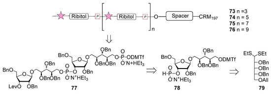 Oligosaccharide synthesis was performed via H-phosphonate chemistry starting from tetrasaccharide building block 77 and using a [4+4] iterative elongation strategy. Tetrameric, hexameric, octameric and decameric PRP fragments were obtained using this iterative approach, followed by the introduction of phosphodiester-linked spacer. Tetrasaccharide 77 was synthesized from disaccharide 78 (Figure 9), in turn obtained from the dithioacetal building block 79. After conjugation to CRM197, immunogenicity studies with the synthetic glycoconjugates 73–76 were performed in a rabbit model. After immunization, sera IgG levels towards the PRP oligosaccharides were determined by glycan array analysis. Tetramer conjugate 73 and octamer conjugate 75 exhibited the highest immunogenicity, most likely indicating that four repeating units are sufficient for immunogenicity, while the hexamer conjugate 74 exhibited lower immunogenicity. This result was ascribed to the folding of the structures and to their different interaction with the immune system receptors. The authors concluded that glycoconjugates of synthetic Hib PRP are immunogenic in a rabbit model and, in particular, tetrameric conjugate 73 is a promising candidate for the design of a new glycoconjugate Hib vaccine.