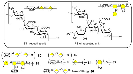 S. pneumoniae serotype 1 (ST1) CPS (Figure 10) contains the rare monosaccharide 2-acetamido-4-amino-2,4,6-trideoxy-d-galactose (d-AAT) bearing a free amine at C-4. Synthetic fragments of ST1 CPS have been reported by Wu et al. [69], Christina et al. [70] and Schumann et al. [71]. In particular, Schumann et al. also contributed to the identification of the protective epitope of ST1 CPS. ST1 is one of the serotypes difficult to target by vaccination due to the low levels of functional antibodies induced by licensed glycoconjugate vaccines. This was recently [72] ascribed to the concealment of the protective epitope during chemical activation and conjugation to carrier protein. Indeed, conjugation strategies by means of reductive amination (PCV13) or 1-cyano-4-dimethylaminopyridine activation chemistry (PCV10) could lead to partial destruction of the d-AAT moieties by reaction with the free amines on this rare monosaccharide. To confirm this assumption Schumann et al. [72] synthesized and tested fragments of ST1 CPS and of the closely related Bacteroides fragilils PS A1 CPS (Figure 10). Synthetic oligosaccharides 80–85 were then subjected to glycan microarray analysis of ST1- and PS A1-directed antisera. Trisaccharide 80 bound to antibodies contained in ST1 typing serum, while disaccharide 82, missing the d-AAT moiety, was bound in a much lower extent, revealing the importance of d-AAT for immune recognition. Neither the PS A1 repeating unit 81 nor d-AAT alone 83 or galacturonic acid alone 84 were bound. Trisaccharide 80 was then conjugated to CRM197 (glycoconjugate 86) by reaction with the thiol group, thus preserving the amino group of d-AAT.