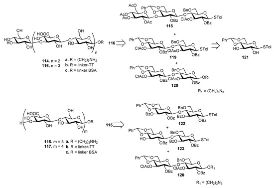 The synthesis of ST3 CPS oligosaccharides 114–117 (Figure 13) has been recently reported by Xiong et al. [82] These oligosaccharides were also designed to have different sugar residues, Glc (114 and 116) or GlcA (115 and 117) at the upstream end. As an example, heptasaccharide 116 was synthesized by a 3+[2+2] glycosylation strategy from trisaccharide 118 and disaccharides 119 and 120, all achieved from common precursor 121. Hexasaccharide 115 was synthesized by a [2+2]+2 strategy from disaccharides 122, 123 and 120. The oligosaccharides were designed to expose a free amino group at their downstream ends (114a–117a) to allow conjugation with tetanus toxoid (TT) (114b–117b) and BSA (114c–117c) carrier proteins. [83]. TT conjugates 114b–117b and free oligosaccharides 114a–117a were injected in mice and the obtained antisera were analyzed by ELISA using BSA conjugates 114c–117c as capture antigens. Antisera derived from mice immunized with TT conjugates 114b–117b contained significantly higher specific antibodies compared to 114a–117a. In particular, antibody titers induced by 114b and 115b were significantly higher than those induced by 116b and 117b, showing that the chain length of ST3 CPS oligosaccharides influences the immunological properties and that longer oligosaccharides are not necessarily better haptens.
