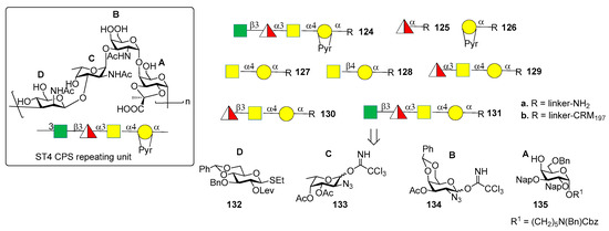 Recently, the Seeberger group [84,85] reported the synthesis and immunological evaluation of fragment 124a, corresponding to the repeating unit, and shorter oligomers 125a–131a with and without the pyruvate ketal, demonstrating the importance of the trans-2,3(S)-pyruvate ketal in the ST4 epitope. In particular, the synthetic fragments were obtained with a linear glycosylation approach from building blocks 132–135 (Figure 13). Of note, for the installation of 1,2-cis linkages, glycosylation of galactose 135 with donor 134 occurred with good stereoselectivity of the newly formed glycosidic linkage (α:β = 7:1). On the other hand, installation of the final β-manno linkage in unit D was accomplished using an indirect two-steps method. Indeed, exclusive β-glucosylation was achieved with donor 132 using NIS and TfOH as promoters. The following 2-OH activation and amination established the desired manno configuration at C-2. Glycan arrays showed that ST4-directed antibodies in the human reference serum (serum 007sp) [85] recognized both pyruvate-dependent and pyruvate-independent epitopes. Oligosaccharide 124a showed the highest antibody affinity and cross-reactivity to ST4 CPS in mice and humans immunized with the natural CPS. Human serum 007sp contains antibodies recognizing also non-pyruvalated oligosaccharides 129a and 131a. Thus, it was hypothesized that non-pyruvalated epitopes could be present in the natural CPS, although non-pyruvalated epitopes could be less immunogenic than pyruvalated epitopes, as indicated by lower antibody binding signals to 129a and 131a compared to 124a. To verify this behavior, two selected CRM197 conjugates of non-pyruvalated ST4 oligosaccharides, 129b and 131b, were used for mice immunization. The raised antibodies did not recognize the natural polysaccharide on the surface of ST4 bacteria. This result confirmed that the pyruvate motif on the oligosaccharide is needed for cross-reactivity with the native CPS.
