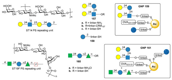 The synthetic branched tetrasaccharide Gal-Glc-(Gal-)GlcNAc (157a), synthesized and studied by Mawas et al. [99] was identified as the smallest structure producing protective antibodies against ST14 when conjugated to CRM197 protein (glycoconjugate 157b) [100]. Tetrasaccharide 157c, derivatized with a terminal thiol for nanoparticle functionalization, was conjugated together with the T cell-stimulating ovalbumin peptide (OVA 323–329) and d-glucose fragment 158 to produce small (2 nm) hybrid gold glyconanoparticles 159 (GNPs, Figure 17). Immunogenicity studies in mice showed that 159 induced the production of specific IgG antibodies against ST14 PS. The presence of OVA 323–339 peptide was necessary for the induction of high affinity IgG antibodies, while the T cell epitope did not raise anti-OVA 323–339 peptide antibodies, thus avoiding the risk of epitope suppression. Sera obtained from mice immunized with 159 with a ratio of tetrasaccharide:Glc:OVA 323–339 = 45:50:5 were able to opsonize ST14 bacteria, although less efficiently than sera from mice immunized with native ST14 PS conjugated to CRM197. These results make 159 a promising S. pneumoniae type 14 vaccine candidate.