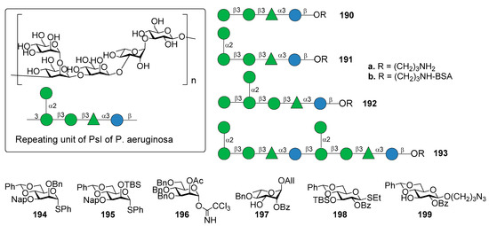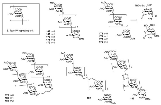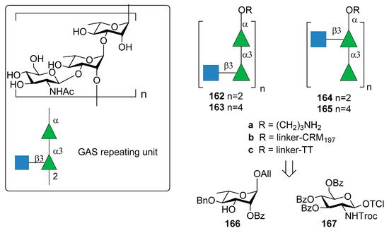 Increasing concerns regarding autoreactivity of antibodies that recognize the native GAC GlcNAc side chain (anti-GlcNAc monoclonal antibodies) [105], however, have been supported by recent studies [106,107]. Cross-reactivity (especially in heart or brain tissues) of anti-GlcNAc mAb was hypothesized almost twenty years ago [108] and it is still a crucial point of discussion, as well as the role of polyrhamnose on the immunogenicity. More recently, Henningham et al. [109] reported that the relative contribution of GlcNAc side chains to the innate immune resistance of GAS varies among strains and that GlcNAc side chain is not a universal GAS virulence factor in animal models. In 2010, Kabanova et al. [104] reported the synthesis of two sets of hexasaccharide- and dodecasaccharide-CRM197 conjugates 162b–165b (Figure 18) and compared their immunogenicity with the native GAC-CRM197 conjugate. All oligomers 162a–165a were synthesized starting from building blocks 166 and 167. Of note, the GAC isolated from bacterial fermentation was found to be contaminated with polyrhamnose variant species. The synthetic oligosaccharide conjugates 162b–165b showed similar immune response in mice compared to GAC conjugate against two GAS isolates of M1 and M23 serotypes. A saccharide chain length of six (the minimal size of the antigen) was found to be sufficient to elicit protective antibodies.