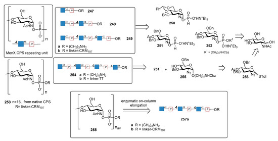- Oldrini, D.; Fiebig, T.; Romano, M.R.; Proietti, D.; Berger, M.; Tontini, M.; De Ricco, R.; Santini, L.; Morelli, L.; Lay, L.; et al. Combined chemical synthesis and tailored enzymatic elongation provide fully synthetic and conjugation-ready neisseria meningitidis serogroup x vaccine antigens. ACS Chem. Biol. 2018, 13, 984–994. [Google Scholar] [CrossRef] [PubMed]