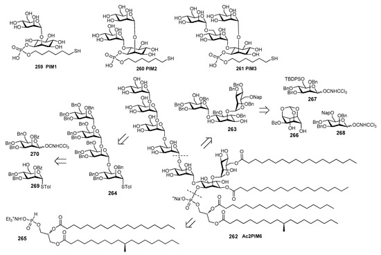 - Boonyarattanakalin, S.; Liu, X.; Michieletti, M.; Lepenies, B.; Seeberger, P.H. Chemical synthesis of all phosphatidylinositol mannoside (PIM) glycans from mycobacterium tuberculosis. J. Am. Chem. Soc. 2008, 130, 16791–16799. [Google Scholar] [CrossRef] [PubMed]