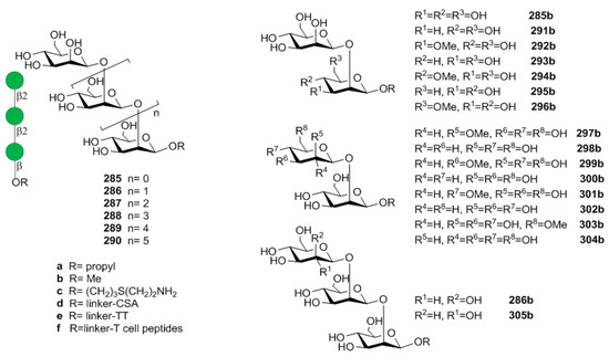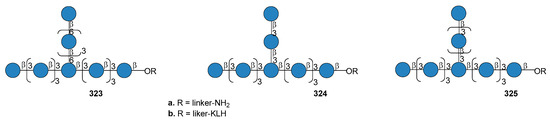 The commercial anti-pneumococcal glycoconjugate vaccine PCV13 includes S. pneumoniae serotype 3 (ST3). However, ST3 glycoconjugate contained in PCV13 has shown an atypical immunogenicity, ascribed to the abundant CPS expression on the capsule and to a weakened booster response leading to hyporesponsiveness (inability of the individual to mount an immune response after booster vaccination) [77,78]. Indeed, the levels of pre-existing ST3-specific antibody were found to be negatively correlated with the B cell memory response to a booster dose of PCV13 containing ST3 glycoconjugate [79]. This behavior has been associated with a lack of protection against acute otitis media [80]. As a consequence, one can assume that pure synthetic antigenic structures, designed on the basis of antibody binding specificities, could improve immunogenic properties of ST3 CPS conjugates. Synthetic oligosaccharides based on ST3 CPS repeating units have been already reported by Benaissa-Trouw et al. in 2001 [80] and they have been proven to protect mice against lethal intraperitoneal challenge with ST3 pneumococci. Recently, Parameswarappa et al. [81] reported the synthesis of a library of oligosaccharides, compounds 103a–110a and their corresponding CRM197 conjugates 103b–110b (Figure 12).