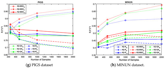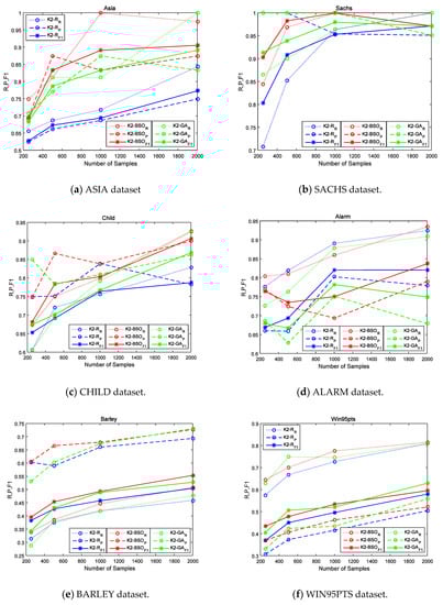 Figure 2a shows the curves of the three methods (K2-R, K2-BSO, K2-GA) with different samples in the data set ASIA. It can be seen that the red curve basically goes above the green one and the blue one, which means that K2-BSO’s indexes R, P, F1 are higher than that of K2-R and K2-GA, thus proves that K2-BSO algorithm is better than K2-R algorithm and K2-GA algorithm.