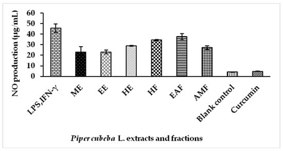 Inflammation is a mechanism of innate immunity, which is defined as a biological response process of vascular tissues to harmful stimuli, for example, damaged cells, irritants and pathogens [23]. Nitric oxide (NO) is an inorganic free radical that is involved in physiological and pathological processes and becomes one of the inflammatory mediators that triggers inflammation in many organs. At lower concentrations, NO has been demonstrated to play a role as a neurotransmitter. However, NO produced at higher concentrations is implicated to have a role in acute or chronic inflammation, ischemic stroke, non-specific host defense, pathogenesis of vasodilation and septic shock [24,25]. In the present study, the NO production by extracts and fractions of P. cubeba L. stimulated with LPS and IFN-γ in RAW 264.7 cells were evaluated. The data are summarized in Figure 1.