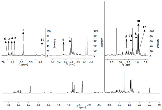 The representative 1H-NMR spectrum of methanol extract of P. cubeba L. The numbers indicate the identified putative metabolites. 1: cubebin; 2: yatein; 3: hinokinin; 4: dihydrocubebin; 5: dihydroclusin; 6: cubebinin; 7: magnosalin; 8: p-cymene; 9: piperidine; 10: cubebol; 11: d-germacrene; 12: ledol.