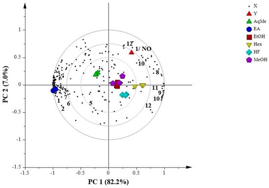 The biplot demonstrates the correlation between extracts and fractions of P. cubeba L. at concentration 62.5 µg/mL with anti-inflammatory activity on nitrite oxide (NO) production. MeOH: methanol extract; EtOH: ethanol extract; Hex: hexane extract; HF: hexane fraction; EA: ethyl acetate fraction; AqMe: aqueous methanol fraction. The numbers indicate the identified putative metabolites. 1: cubebin; 2: yatein; 3: hinokinin; 4: dihydrocubebin; 5: dihydroclusin; 6: cubebinin; 7: magnosalin; 8: p-cymene; 9: piperidine; 10: cubebol; 11: d-germacrene; 12: ledol. X: metabolites in P. cubeba L., Y: 1/NO.
