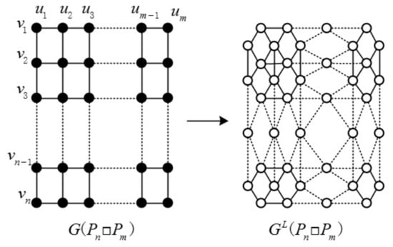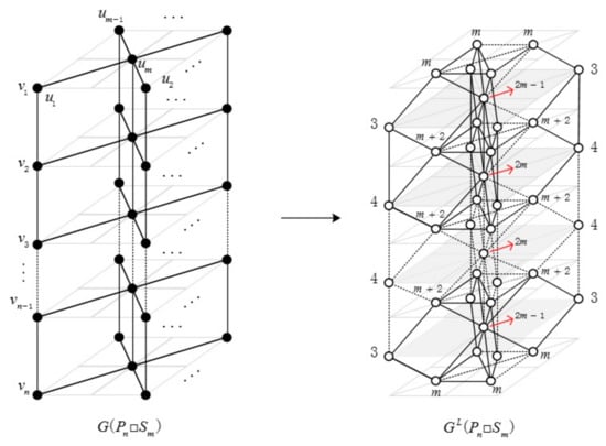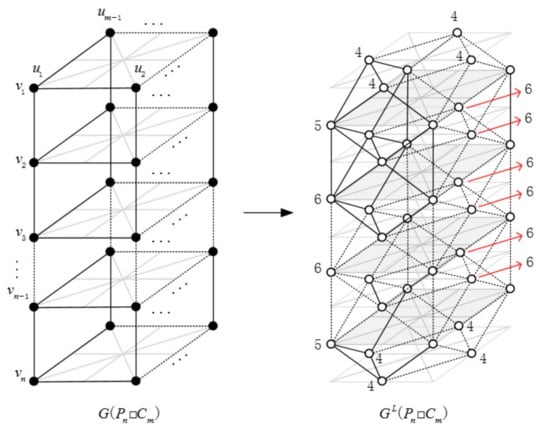 Let , we have has edges. Moreover, , , and . In Figure 2, the degrees of vertices in line graph are displayed near the corresponding vertices.