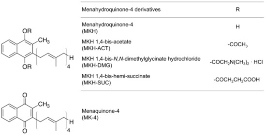 Chemical structures of menahydroquinone-4 (MKH)-ester derivatives and menaquinone-4 (MK-4).