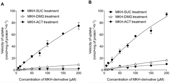 Kinetic plots for the uptake of MKH-ester derivatives in HCC cells. (A) PLC/PRF/5 and (B) SK-Hep-1 cells were treated with various concentrations of MKH-ACT, MKH-DMG or MKH-SUC. The curves represent the best fit of the Michaelis--Menten equation to the data. Each point represents the mean ± SD from duplicate experiments.