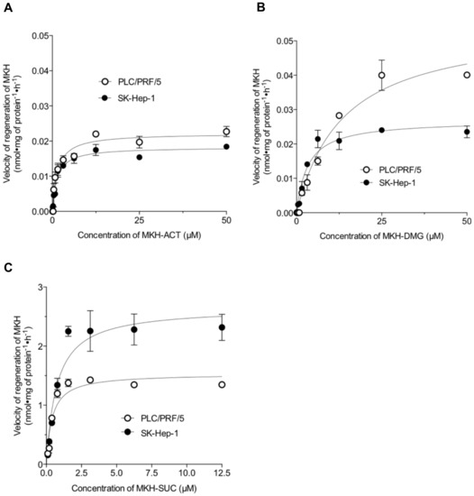 Kinetic plots for the regeneration of MKH-ester derivatives to MKH in S9 fractions of PLC/PRF/5 or SK-Hep-1 cells. (A) MKH acetate (MKH-ACT); (B) MKH dimethylglycinate (MKH-DMG); and (C) MKH succinate (MKH-SUC). Each point represents the mean ± SD from duplicate experiments.