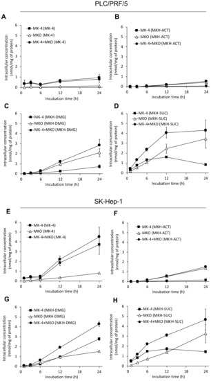 MKH delivery into HCC cell lines via MKH-ester prodrugs or MK-4. Intracellular MK-4 and MKO concentration–time profiles following 25 μM MKH-ester prodrug or MK-4 treatment of PLC/PRF/5 (A–D) and SK-Hep-1 (E–H) cell lines. (A,E), MK-4; (B,F), MKH-ACT; (C,G), MKH-DMG; (D,H), MKH-SUC. Symbols: ■, MK-4; △, MKO; ●, MK-4 + MKO after MKH-ester prodrug or MK-4 treatment. Error bars indicate means ± SDs (n = 3).