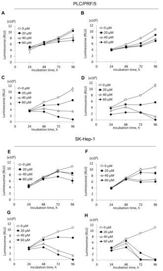 Cell viability was determined using a previously reported method [22]. Briefly, PLC/PRF/5 and SK-Hep-1 cells were plated at 5.0 × 103 cells/well in 96-well plates and allowed to attach for 48 h. MK-4 and MKH-ACT were dissolved in 99.5% ethanol. MKH-SUC was dissolved in DMSO. MKH-DMG was dissolved in sterilized water. Stock solutions of each drug (50 mM) were diluted to the intended final concentrations with medium. Cells were exposed to MK-4, MKH-ACT, MKH-DMG or MKH-SUC for up to 96 h, and cell viability was evaluated using the Cell Titer-Glo Luminescent Cell Viability Assay (Promega, Madison, WI, USA) according to the manufacturer’s instructions. IC50 values were determined by a log [drug] vs. normalized response-variable slope analysis of GraphPad Prism, version 6.0 (GraphPad Software, San Diego, CA, USA).