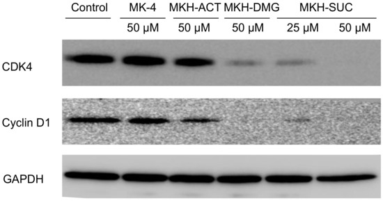 We previously reported that MKH-DMG regulates cell cycle-related proteins as a mechanism of MKH-DMG-induced growth inhibition in PLC/PRF/5, Hep3B and SK-Hep-1 cells [22]. Thus, to clarify the mechanisms of the growth inhibition induced by the MKH-ester prodrugs, we analyzed cell cycle-related proteins using Western blotting (Figure 7). MKH-DMG and MKH-SUC clearly suppressed both cyclin D1 and CDK4 expression compared with controls. MKH-SUC at 50 μM induced a more potent inhibitory effect than 25 μM MKH-SUC on both protein levels. In contrast, MK-4 and MKH-ACT did not affect the expression of the proteins at 24 h after treatment.