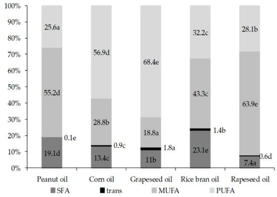 The results for the fatty acids composition of the selected refined edible oils are similar to those obtained by other authors. Accordingly, peanut oil contains 19.1% of saturated acids, 55.2% of monounsaturated, and 25.6% of polyunsaturates [2,3,8,10,16,17,18,30]; in corn oil, there is 56.9% polyunsaturated fatty acids, 28.8% monounsaturated, and 13.4% saturated acids [3,4,8,17,20,21,31,32,33]. In rice bran, oil of saturated fatty acids accounts for about 23.1%, monounsaturated 43.3%, and polyunsaturated 32.2% [9,11,24,25]. Rapeseed oil, compared with other oils, contains the least saturated acids (7.4%) of about 63.9% of monounsaturated acids and 28.1% of polyunsaturates [3,4,8,13,33,34,35]; grapeseed oil contains a significant amount of polyunsaturated fatty acids—about 68.4%, 18.8% are monounsaturated, and 11% saturated fatty acids [3,4,5,8,9,26,36,37].