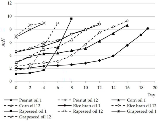 It was observed that changes in the AnV value in grape, rice bran, peanut, and corn seed oils followed gradually and slowly on the subsequent days of thermostation both in fresh and stored oils. Peanut and corn oil oxidized slightly faster in the 12th month compared with the initial period. Only in rapeseed oil was there a sharp and distinct increase in the value of AnV, which proves that in rapeseed oil, secondary oxidation products are formed faster than in other oils. For grapeseed oil, an AnV = 8 was reached the fastest after just one day, however, this may be due to the fact that the initial AnV value in the oil was high (6.8 in fresh and 7 in stored oil), whereas this value was exceeded in peanut oil only after 18 days.