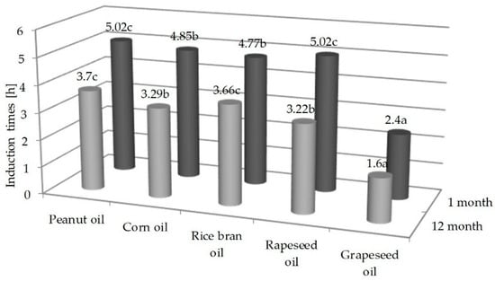 Conducting the Rancimat test allowed to determine the time of induction of the tested oils (Figure 4). Among the tested oils, the longest induction times in the first month of oil storage were determined for peanut oil and rapeseed oil (5 h), these oils were characterized by similar initial PV values (Table 1).